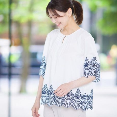 オリジナル刺繍柄を施した生地を用いて、おつくりしたブラウス。