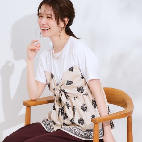 レイヤード風Tシャツは、1枚で華やかな印象になります。