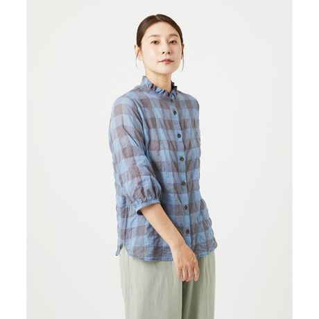 共布のフリルをスタンドカラーにつけてやさしい印象の衿に、袖口にギャザーテクニックを施したふくらみのある袖がポイントのブラウスです。センターフロントが釦開き仕様で、夏らしいカラーリングのチェック柄もポイントです。裾はラウンドデザインなので、アウトしても着こなせます。