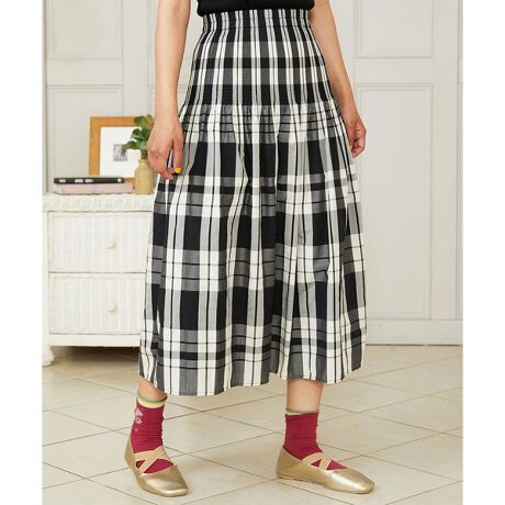 二つのデザインが楽しめるスカート。ゴムシャーリングでウエスト部分はすっきり、腰から下はゆるやかなAラインシルエットです。合わせるトップスや、気分で変えられるリバーシブルタイプ仕様。表面は大きなチェック柄、裏面は太さの異なるストライプを組み合わせたランダムストライプ柄のデザインです。ウエストの伸縮性が高く、リラクシーな着用感も魅力に。