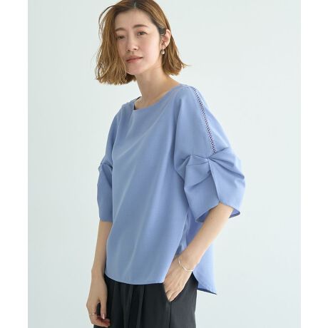 立体的なねじりスリーブとハシゴレースが華やかなブラウス。