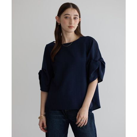 立体的なねじりスリーブとハシゴレースが華やかなブラウス。