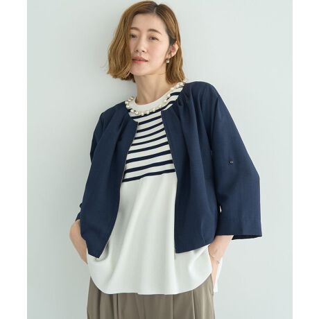 シンプルなノーカラーにフロントのタックがデザインのアクセントになっています。