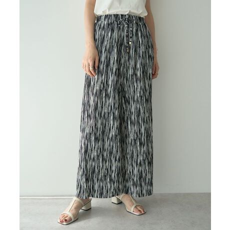 プリーツ加工を施したランダムアート柄が目を惹くデザインパンツ。