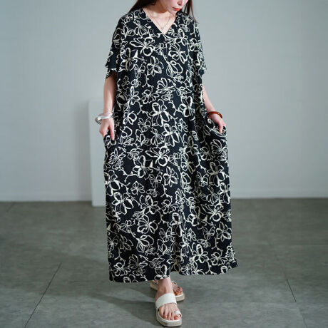 アートスティックな花柄が目を惹く、マキシ丈ワンピースの登場です☆首元もVネックでスッキリ!ゆったりとしたシルエットで体型も拾わずリラックシーな着心地です◎シンプルなストンっと真っ直ぐ落ちるシルエットなので、ベルトをしたり、小物でアレンジしてコーデの幅が広がります♪おでかけにもお家でのまったりタイムにも心地よく着られるアイテムです☆