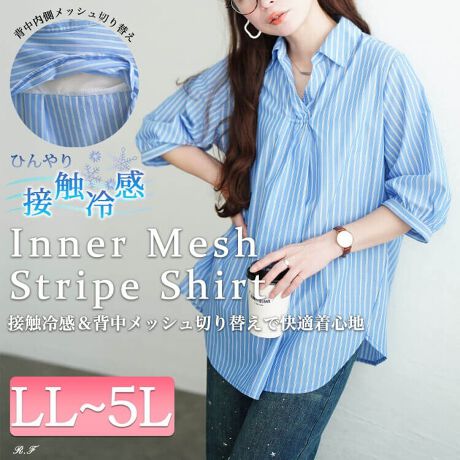 【大きいサイズ】 接触冷感背中メッシュストライプシャツ 大きいサイズ レディース トップス ブラウス