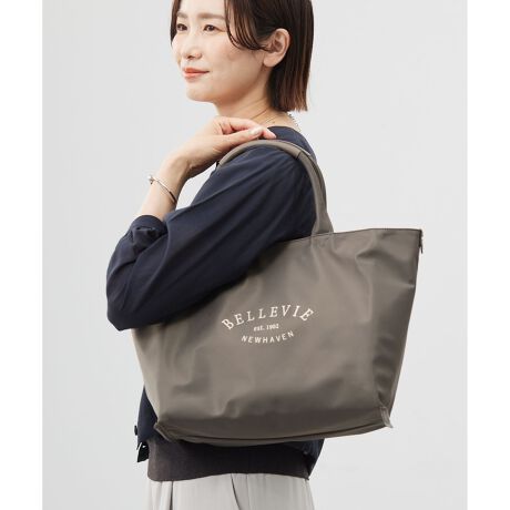 おしゃれに持てる、多機能&リバーシブルナイロントートバッグ■デザイン撥水・軽量・リバーシブル・A4サイズ対応の多機能のナイロントートバッグです。A4サイズ対応ながら、とても軽く、パソコン・水筒・折り畳み日傘など、必要なものを収納頂ける大容量サイズ。たくさんの荷物を持ち運ぶ旅行や、フィットネスシーンにもお使い頂け、内側には4つのポケット付で小物なども細かく収納できます。またリバーシブル仕様でその日の気分に合わせてお楽しみ頂け、季節をを問わずマルチに活躍してくれます。色展開は、#030モカはシックなモカに内側はグリーンがかったマスタードイエローの組み合わせ、#033ベージュは使いやすいベージュに内側はスモーキーサックスの組み合わせ、#075ネイビーはトラッドな深いネイビーと内側は明るめのベージュの、3色展開です。フロントのプリントはラメを入れ込み、程よく上品に輝きます。*プリント【BELLEVIE】意味:フランス語で美しい人生