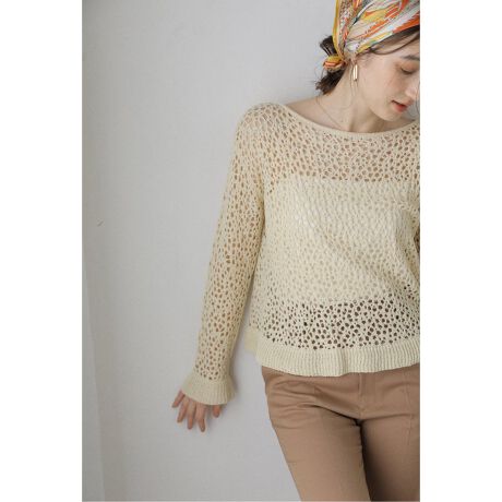 リラックス感のあるサイジング、クロシェ編みなので長袖でも涼し気。