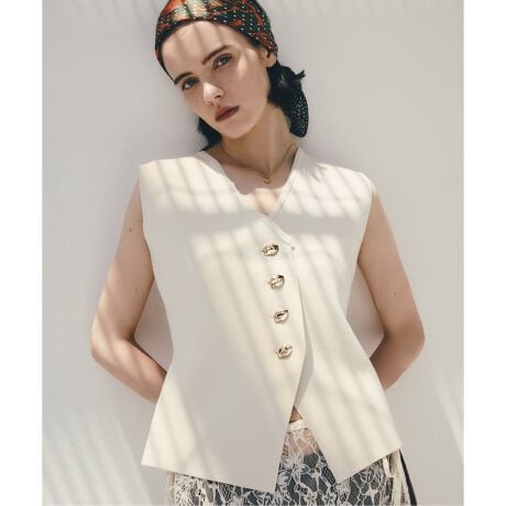コンパクトな着丈とデコルテが覗くネックラインでスタイルアップできるニットベスト。