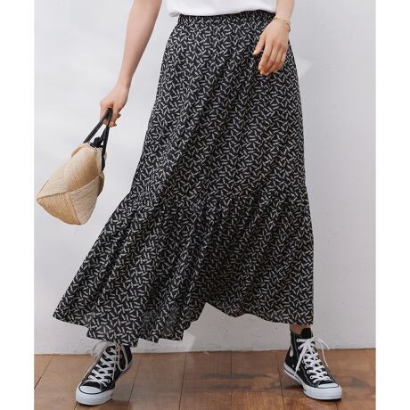 夏らしいモチーフのプリント生地を使ったティアードスカート。動くたびに揺れるシルエットが華やかな印象に。ウエストはゴムギャザー仕様で着やすく、腰回りにボリュームが出すぎないようなシルエットに仕上げています。合わせるトップス次第でオン・オフ問わず着用可能なアイテムです。ご自宅で洗濯可能なイージーケアなのも嬉しいポイント。カラーは、シックな印象のブラックプリント(#505)と品の良い着こなしを叶えるネイビープリント(#575)の2色展開です。