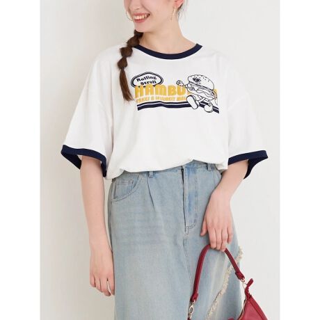 ポップなハンバーガーのキャラクタープリントがチャーミングなリンガーTシャツ
