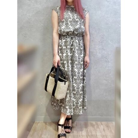 一枚で華やかなコーディネートがキマるので、ピアスやバッグなどの小物でアクセントをつけるのが◎