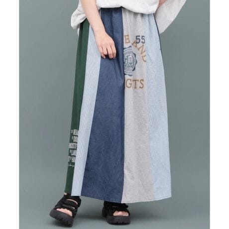 デニムやカレッジプリント柄の生地を組み合わせた、カジュアルに着られるリメイク風スカート。
