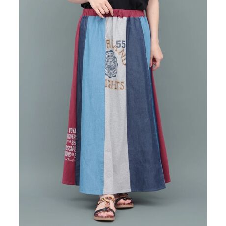 デニムやカレッジプリント柄の生地を組み合わせた、カジュアルに着られるリメイク風スカート。