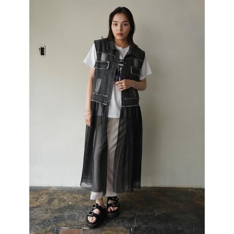 デニム×チュールの甘めカジュアルなレイヤードワンピース。