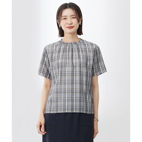 ■デザイン襟元にゴムを入れたボタンレス仕様で、着脱もスムーズなブラウスライクカットソー。フリル襟のようなニュアンスが生まれ、さりげないアクセントになっています。袖口にはほんのりと広がりを持たせたフレアシルエットを取り入れ、腕周りを柔らかくカバー。身頃は肌からふわりと離れるゆとりあるシルエットで、涼しげな肌離れの良い1枚です。身頃の内側にはジャージインナーを重ね、透け感を気にせず1枚でさらりと着用できる仕立てにしました。カラーは、明るい差し色の入った清潔感のあるオフストライプ(#101)、涼し気な差し色の入った肌なじみの良いグレージュストライプ(#133)のストライプ柄2色と、コーディネートの上品なアクセントになるグレーチェック(#304)、落ち着きのある洗練された雰囲気のダークブラウンチェック(#335)のチェック柄2色の全4色展開。