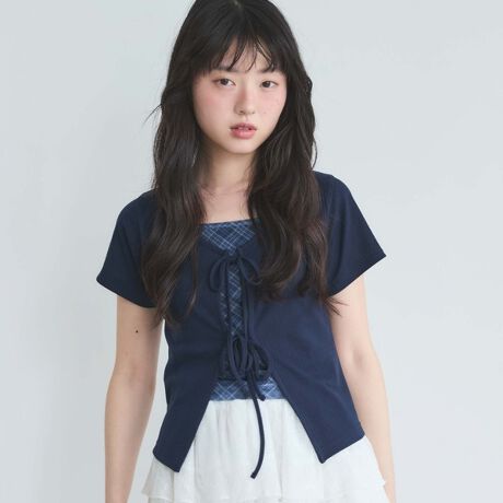 フロントリボンが目を引くカーディガンとチェック柄のキャミソールのセットアイテム。
