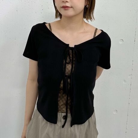 フロントリボンが目を引くカーディガンとチェック柄のキャミソールのセットアイテム。