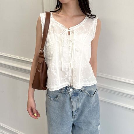 コットンレースが女性らしさを演出するノースリーブブラウス。