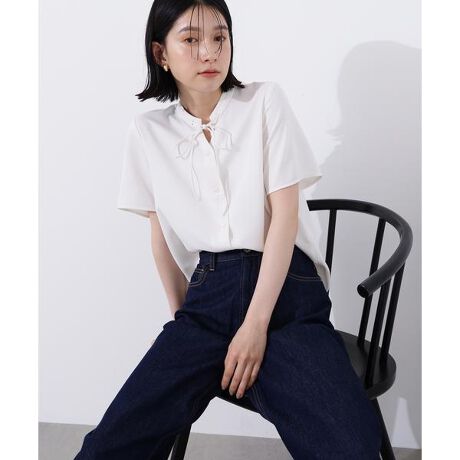 首元にあしらった共地の華奢なリボンタイがポイントになったブラウス。身頃と袖はすっきりとしたデザインにし、襟の甘さを中和することで大人っぽいバランスに見せてくれるので、ONもOFFスタイルにもおすすめ。1枚で着るのはもちろん、ジャケットインにも使いやすいシルエットです。デニムを合わせればOFFカジュアルにも着ていただけます。<素材>肌触りが心地よい合繊素材を使用。ジョーゼットの表面が上品なトロミ素材でシワになりにくく扱いやすい素材です。<詳細>仕様・前ボタン裏地・なし透け感・ややあり / 光沢・なし / 伸縮性・なし生地の厚さ・普通※モデルの着用画像の場合、光の当たり具合により、実際の色味と異なって見えることがございます。色味は、商品単体の画像をご参照ください。