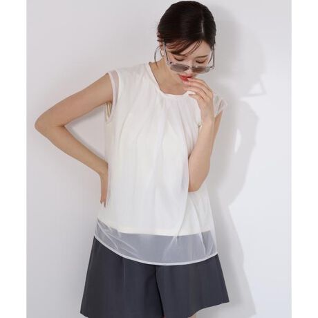 カットソーに2枚のチュールを重ねたデザインで、様々な着方ができるトップスです。チュールはタック入りでふんわりと立体感を演出。ゆとりのあるシルエットなので動きやすさも嬉しいポイントです。お勧めのコーディネート(1)下のカットソーのみINしてパンツやナロースカート、(2)ウエストINしてフレアスカート、(3)ウエストOUTでフレアパンツやナロースカート