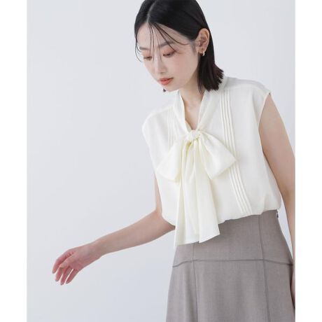楊柳素材を使用したボウタイデザインのブラウス。襟から続くボウタイリボンで、顔まわりを華やかに見せてくれます。ボリューミーなボウタイ部分はリボン結びがおすすめ。袖は程よいフレンチスリーブで肩まわりをやさしくカバーします。ジャケットインや1枚着としてもスタイリングのアクセントになり、幅広いシーンで着ていただけます。<素材>柔らかく縦目に表情のある楊柳素材を使用しています。<詳細>仕様・開閉なし裏地・あり透け感・ややあり / 光沢・なし / 伸縮性・あり生地の厚さ・普通※モデルの着用画像の場合、光の当たり具合により、実際の色味と異なって見えることがございます。色味は、商品単体の画像をご参照ください。
