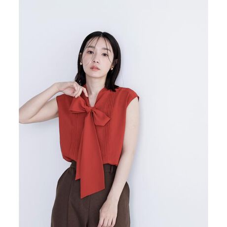 楊柳素材を使用したボウタイデザインのブラウス。襟から続くボウタイリボンで、顔まわりを華やかに見せてくれます。ボリューミーなボウタイ部分はリボン結びがおすすめ。袖は程よいフレンチスリーブで肩まわりをやさしくカバーします。ジャケットインや1枚着としてもスタイリングのアクセントになり、幅広いシーンで着ていただけます。<素材>柔らかく縦目に表情のある楊柳素材を使用しています。<詳細>仕様・開閉なし裏地・あり透け感・ややあり / 光沢・なし / 伸縮性・あり生地の厚さ・普通※モデルの着用画像の場合、光の当たり具合により、実際の色味と異なって見えることがございます。色味は、商品単体の画像をご参照ください。
