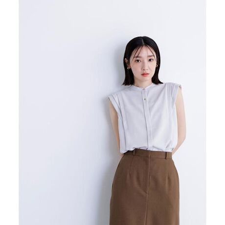 フロントのゴールドカラー釦がきらっとポイントで、ジャケットインにも活躍できるブラウス。袖はフレアのないフリルスリーブで甘くなりすぎず、肩先からそっと覆うフリルで二の腕をカバー。襟のバンドカラーデザインがスタイリッシュな印象に見せてくれます。<素材>肌触りが心地よい合繊素材を使用。ジョーゼットの表面が上品なとろみ素材でシワになりにくく、扱いやすい素材です。<詳細>仕様・前ボタン裏地・なし透け感・ややあり / 光沢・なし / 伸縮性・なし生地の厚さ・普通※モデルの着用画像の場合、光の当たり具合により、実際の色味と異なって見えることがございます。色味は、商品単体の画像をご参照ください。
