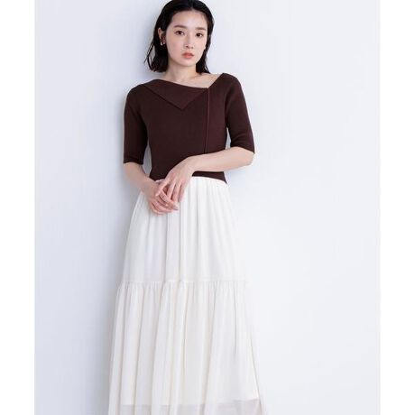 アシンメトリーに襟を折り返したデザインがポイントのドッキングニットワンピース。少し広めの襟ぐりがデコルテラインをキレイに見せながら、抜け感を演出。ウエスト内側はぐるりゴム仕様でストレスフリーな着心地です。スカート部分は軽い楊柳素材をティアードに切り替えているので、揺れ感のあるシルエットを叶えます。<素材>ニットはさらっとしたタッチの糸でリブ編み。スカートは軽やかで透け感のある楊柳素材を使用しています。<詳細>仕様・開閉なし裏地・スカートはあり透け感・ニットはなし、スカートはあり / 光沢・なし / 伸縮性・ニットはあり、スカートはややあり生地の厚さ・ニットは普通、スカートは薄手※モデルの着用画像の場合、光の当たり具合により、実際の色味と異なって見えることがございます。色味は、商品単体の画像をご参照ください。