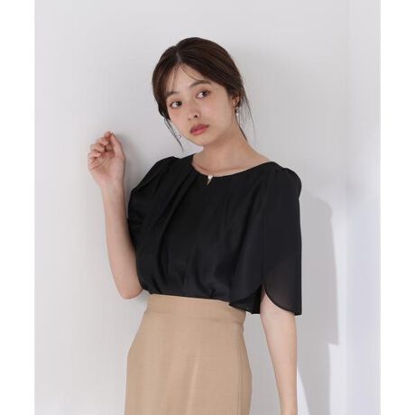 PROPORTIONで大人気のチューリップスリーブブラウスです。袖丈があるので、気になる二の腕をやさしくカバー。襟のタックと大きなパール調が上品な印象に見せてくれます。身頃は裏地が付いているので安心して着用いただけます。