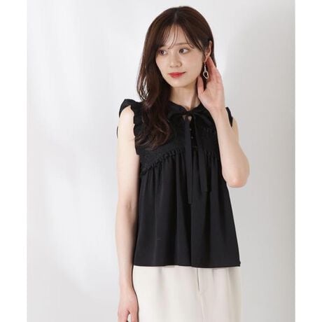 レースとフリルの組み合わせがボヘミアンシックなムード漂うブラウスです。細めのボウタイデザインが今年らしいポイント。デニムスタイル、キレイめボトムスにも相性が良く、様々なシーンで着ていただけます。