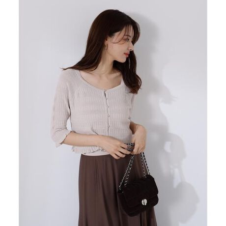 接触冷感のあるニットアンサンブルです。カーディガンもタンクトップも前後2wayで着られるデザイン。カーディガンは袖口と裾のフリルデザインを入れ、きらっと光る小さいボタンがポイントです。ショート丈なので脚長効果を期待できます。
