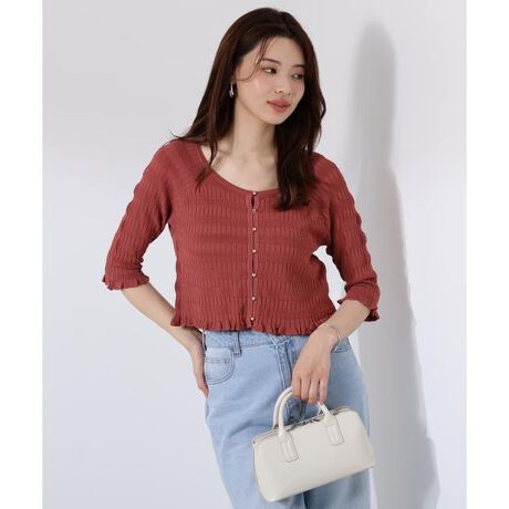 接触冷感のあるニットアンサンブルです。カーディガンもタンクトップも前後2wayで着られるデザイン。カーディガンは袖口と裾のフリルデザインを入れ、きらっと光る小さいボタンがポイントです。ショート丈なので脚長効果を期待できます。