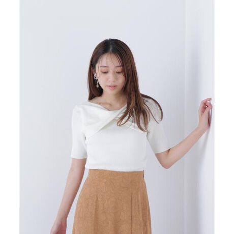 フロントにツイストデザインを入れた大人っぽい雰囲気のニットプルオーバー。ツイストデザインが顔まわりを華やかに印象づけながら、少し開けた襟ぐりがデコルテラインをすっきり見せてくれます。リブ編みですっきりと編み立てたニットは、フレアスカートを合わせるなど、フェミニンなスタイリングがおすすめです。<素材>清涼感のあるタッチの糸を使い、リブ編みで編み立てています。<詳細>仕様・開閉なし裏地・なし透け感・なし / 光沢・なし / 伸縮性・あり生地の厚さ・普通※モデルの着用画像の場合、光の当たり具合により、実際の色味と異なって見えることがございます。色味は、商品単体の画像をご参照ください。