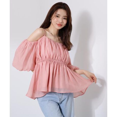 ほどよいボリュームのシャーリングデザインが、女性らしいオフショルブラウスです。胸下はゴム入りなので動きやすく、シアー素材でオトナの可愛さをアップ。背中はストラップとリボンで印象的に。お尻の着丈が少し長いデザインのため、後ろ姿を気にしないで着られます。