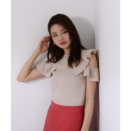 袖からチラッと肌見せするデザインが女性らしいラッフルニットです。ラッフル端に配色のシアーニットを合わせて、オトナ可愛いポイントをプラス。スカートにもパンツにも着回せるデザインです。