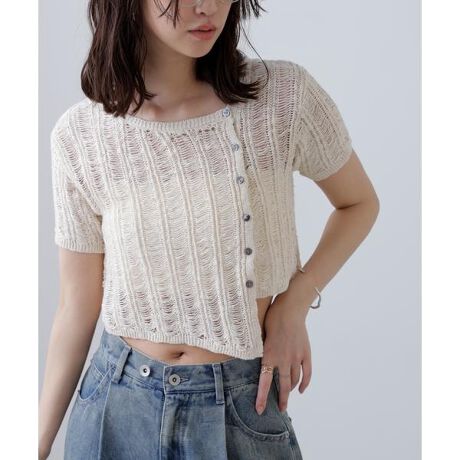 ダメージライクなストライプ柄の透かし編みニット。アシンメトリーな釦とヘムデザインがポイント。身頃は少しゆったりしつつも、袖はタイトめなのでスタイルアップして見えます。夏らしい粗野な雰囲気がかわいいデザイン。デニムパンツを合わせるだけでもスタイリングが決まります!カップ付きショート丈キャミソール(店舗商品番号131-5160018)をインナーにし、おなかもヘルシーに肌見せするのがおすすめ!※モデルの着用画像の場合、光の当たり具合により、実際の色味と異なって見えることがございます。色味は、商品単体の画像をご参照ください。