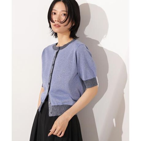 バイカラー配色がコーディネートのポイントになるカーディガン。シアーで軽さもありながら、2枚仕立てなので透け感が強くなりすぎず、前を閉めてトップスとしても着られます。前を開けて羽織ると、裏側のカラーが見えるのもポイント。貝調ボタンが夏らしい印象に見せてくれます。<素材>軽いシアーなニットを2重に使った編地。表面にラメ糸を引き揃えた天竺編みです。<詳細>仕様・前ボタン裏地・なし透け感・なし / 光沢・あり / 伸縮性・あり 生地の厚さ・普通※モデルの着用画像の場合、光の当たり具合により、実際の色味と異なって見えることがございます。