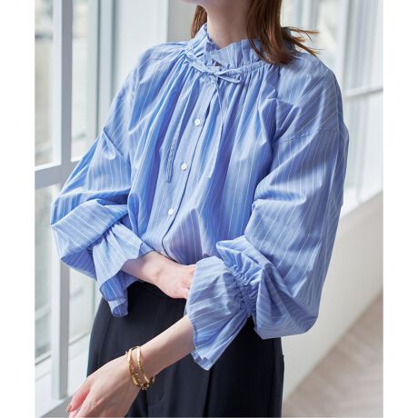 程よいフリルカラーとフロントのリボンディテールがポイントのブラウス。