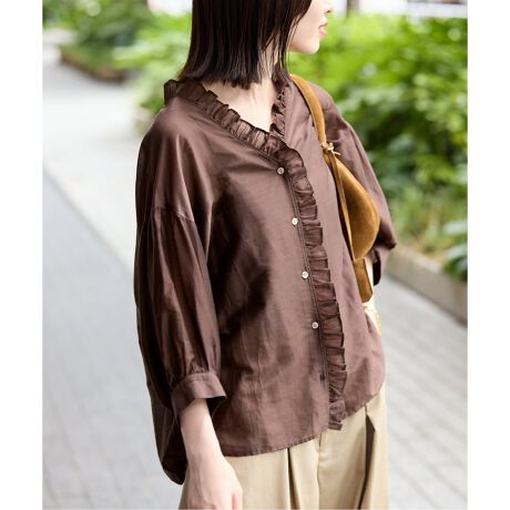 すっきりとしたvネックにフリルをあしらったSLOBEらしいデザイン。