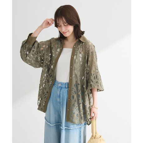 上品なレース素材で仕立てたブラウス。肩の落ちたボックスシルエットで着心地よく、暑い季節の軽い羽織物としてもおすすめです。透け感を活かしてインナーとのコントラストを楽しめるのも魅力的。合わせ方次第でロングシーズン活躍するおすすめのアイテムです。透け感[ややあり]