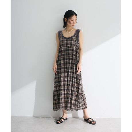 でこぼこ感を出した生地にチェック柄が魅力的なキャミソールワンピース。胸下で切り替えたゆったりとしたボリュームシルエットが女性らしいデザインです。華奢な肩ストラップがさり気なく抜け感を演出し、バックリボンが目を惹くアクセントに。ナチュラルな雰囲気がお洒落に着映えを叶えてくれます。インナー合わせでレイヤードのスタイリングにもおすすめ。透け感[ややあり]