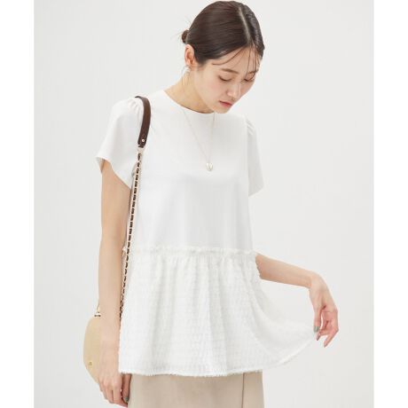 【スタッフコメント】▼身長158cm|着用サイズ2 (通常着用サイズM)フェザー調のペプラム部分が華やかでフェミニンな1枚映えトップス。カットソーながら大人の上品な甘さを演出してくれるこの夏イチオシのアイテムです。