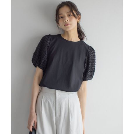 ■デザイン・袖にフェザー調のカットジャカートを使用した主役級のトップス。・ふんわりとした5分丈のパフスリーブは、程よく透けることでコーデ全体を軽やかな印象に。・身頃はキレイ目な表面の綿のジャージー素材を使用。・大きすぎない程よい寸法感で体にフィットし着心地も抜群。・裾のカーブディティールや後のパール釦もポイント。