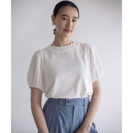 ■デザイン・袖にフェザー調のカットジャカートを使用した主役級のトップス。・ふんわりとした5分丈のパフスリーブは、程よく透けることでコーデ全体を軽やかな印象に。・身頃はキレイ目な表面の綿のジャージー素材を使用。・大きすぎない程よい寸法感で体にフィットし着心地も抜群。・裾のカーブディティールや後のパール釦もポイント。
