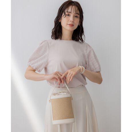 ■デザイン・袖にフェザー調のカットジャカートを使用した主役級のトップス。・ふんわりとした5分丈のパフスリーブは、程よく透けることでコーデ全体を軽やかな印象に。・身頃はキレイ目な表面の綿のジャージー素材を使用。・大きすぎない程よい寸法感で体にフィットし着心地も抜群。・裾のカーブディティールや後のパール釦もポイント。