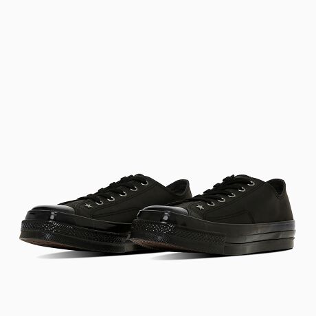 全体をオールブラックでまとめ、ダルブラックのハトメを採用することでシックにまとめ、つま先側から一つ目のハトメはコンバースらしい星型のスタッズにアレンジ。