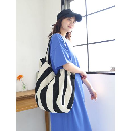 太めのストライプ柄が目を引く、ソフトな風合いのビッグトートバッグです。くたっとした生地感で、肩にかけた時も体に優しくフィットします。内側には吊り下げポケットが付いているので、小物も迷子にならず、必要な時にサッと取り出せます。雑誌や書類、着替えなども余裕で収納できる大容量サイズなので、通勤・通学、お買い物、レジャーなど、様々なシーンで活躍します。気兼ねなく使える、頼れるビッグトートです。
