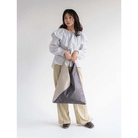 三角形のフォルムが目を引く、コンビ素材のデザイントートバッグ。三角シルエットは、コーディネートにエッジをプラスします。ショルダーバッグとして、ハンドルを持てばハンドバッグとして使える2way仕様。マグネットボタンで開閉しやすく、内側のポケットで小物を整理できます。大胆なサイズ感ながらも、日常使いに必要な機能も備わった、おしゃれで実用的なトートバッグです。