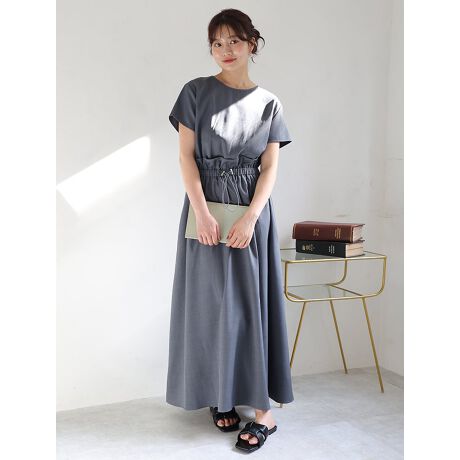 ウエストに寄せたギャザーがポイントのロングワンピース